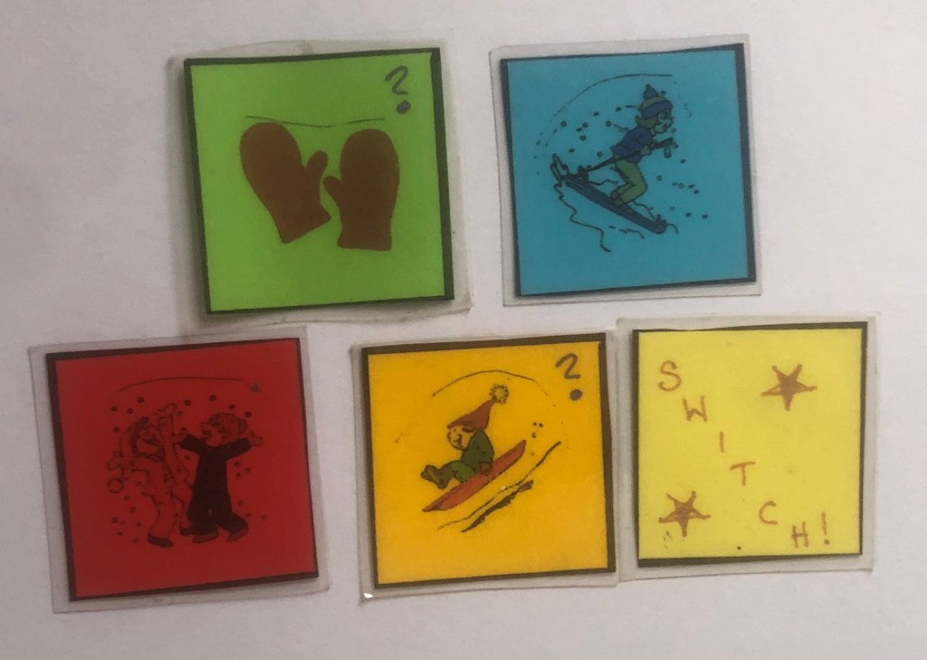 - The small cards with the pictures will of course last longer if you laminate them. Before laminating, put questions marks on some of them. This will be explained below. Also make about 10 cards with “Switch” written on them.
